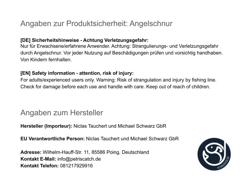 Nur für Erwachsene/erfahrene Anwender. Achtung: Strangulierungs- und Verletzungsgefahr durch Angelschnur. Vor jeder Nutzung auf Beschädigungen prüfen und vorsichtig handhaben. Von Kindern fernhalten.